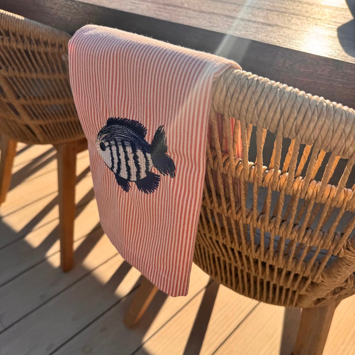 Servet rood/wit gestreept met geborduurde vis - Petit Poisson set van 2