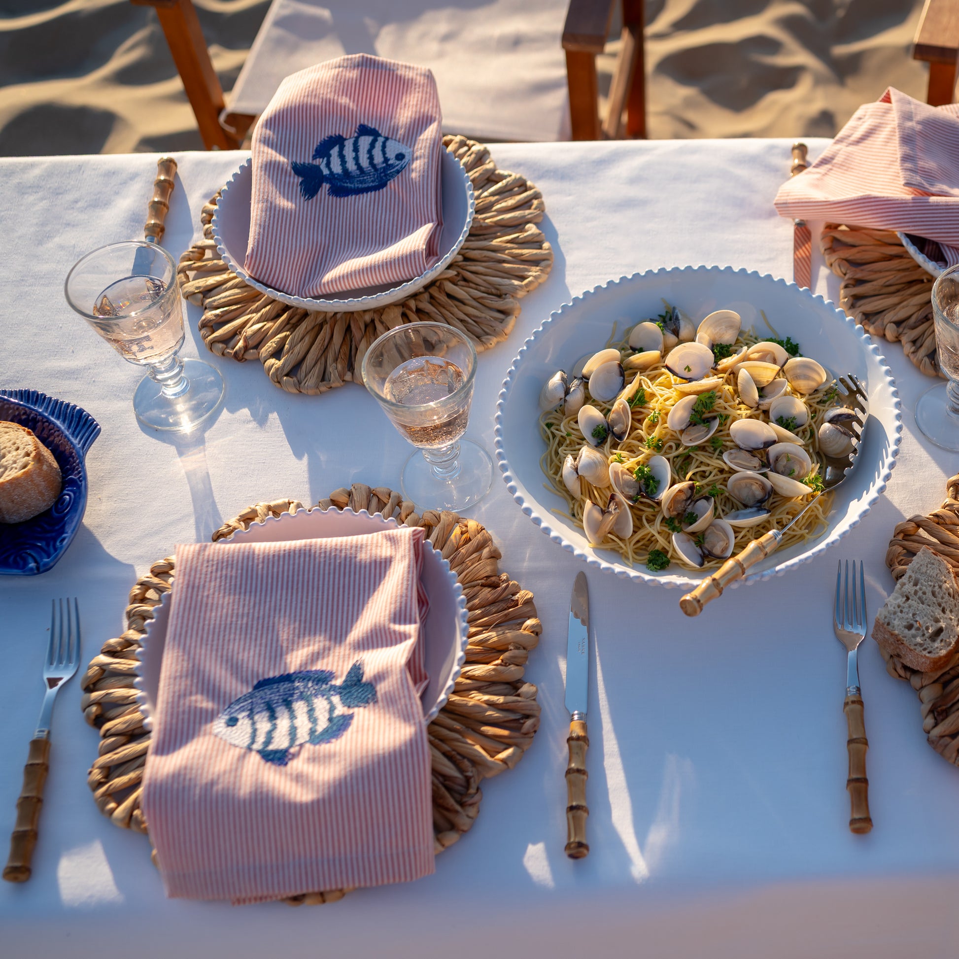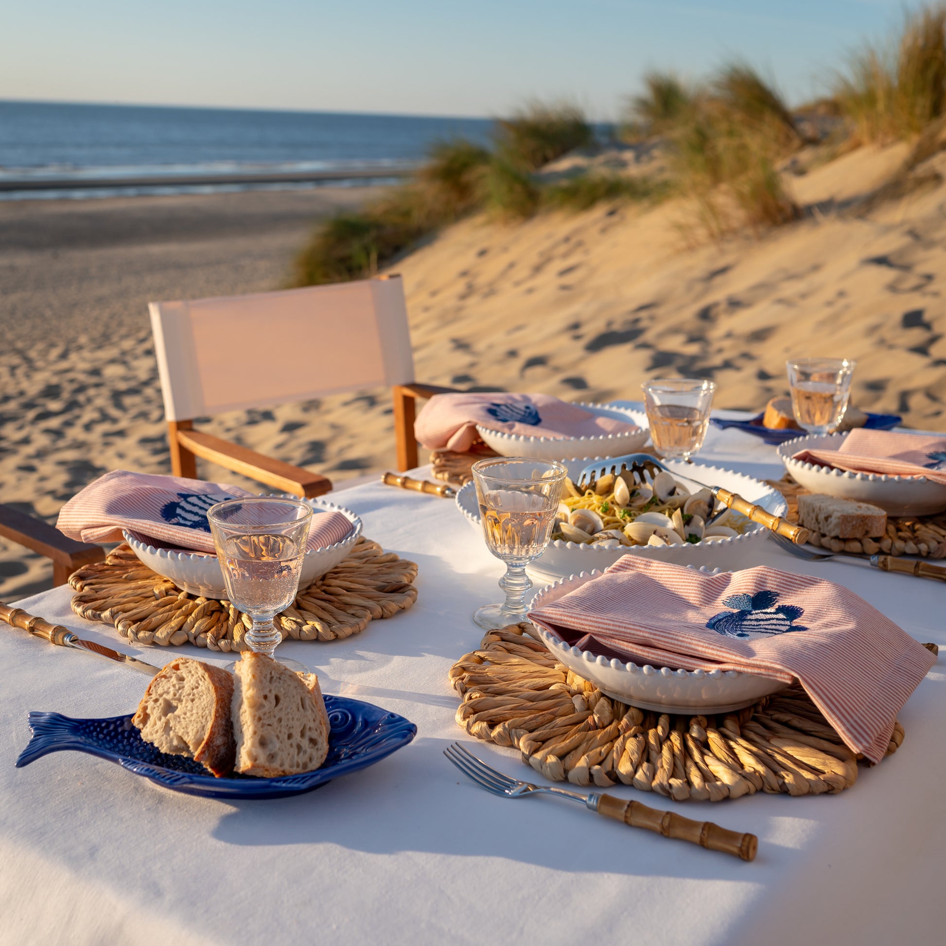 Maak je zomerse tafel compleet met onze Petit Poisson servetten. Deze servetten (50x50cm) gemaakt van hoogwaardig linnen & katoen zijn een lust voor het oog. De zachtrode streep geeft nog net even een extra zomers tintje en het prachtig afgewerkte blauwe visborduursel zorgt voor een nautisch gevoel. Wissel ze af met onze Fresh Lobster servetten op ons Out of the Blue of Wimbledon White tafelkleed voor een complete look. Maar eerlijk... ze hebben eigenlijk niet eens een tafelkleed nodig!
